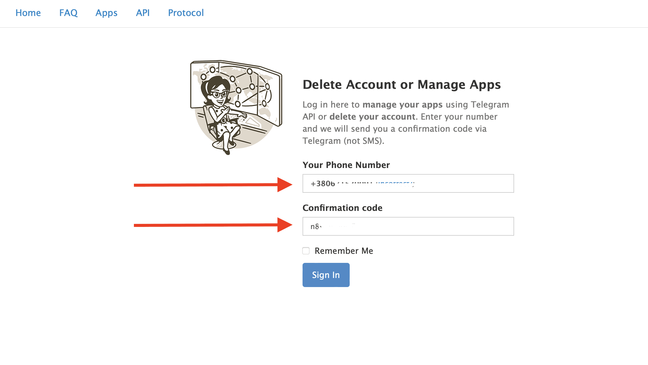 The easiest and fastest way to delete Telegram is through a browser. To do this, go to this link. In the window that appears, enter the phone number linked to your account and then the confirmation code that will be sent directly to your Telegram app on your computer or phone.