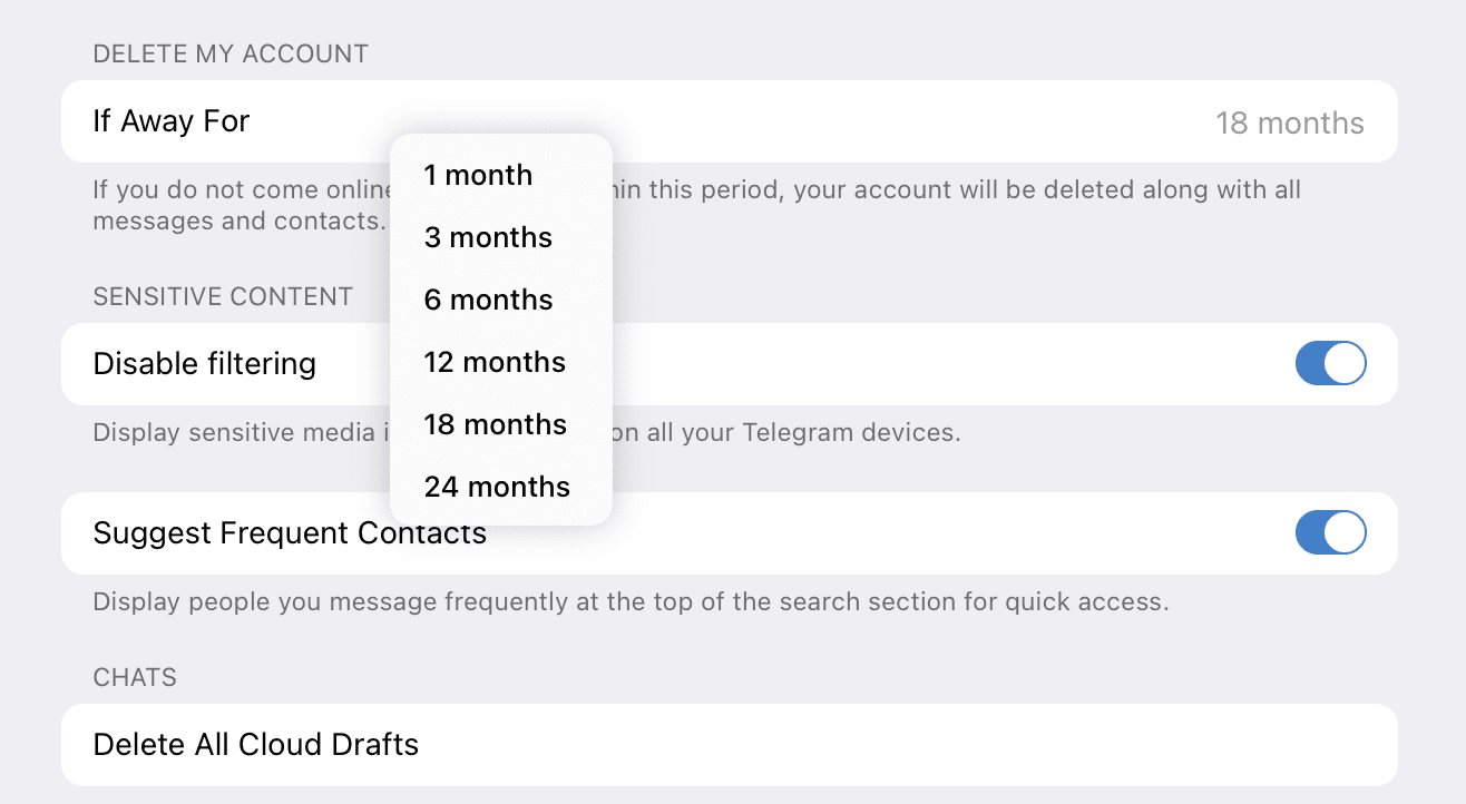 If you prefer not to delete your account manually, Telegram offers an auto-deletion option.