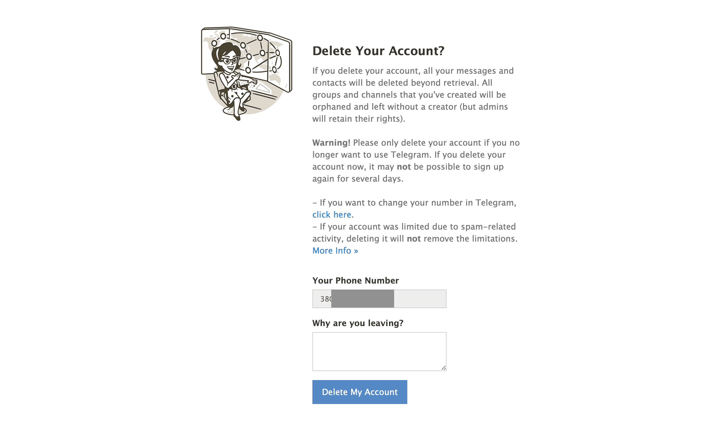 Important: If you plan to change your phone number, there is no need to delete your Telegram account. You can simply change your number—this feature is built into the app. In this case, all your information will be preserved.