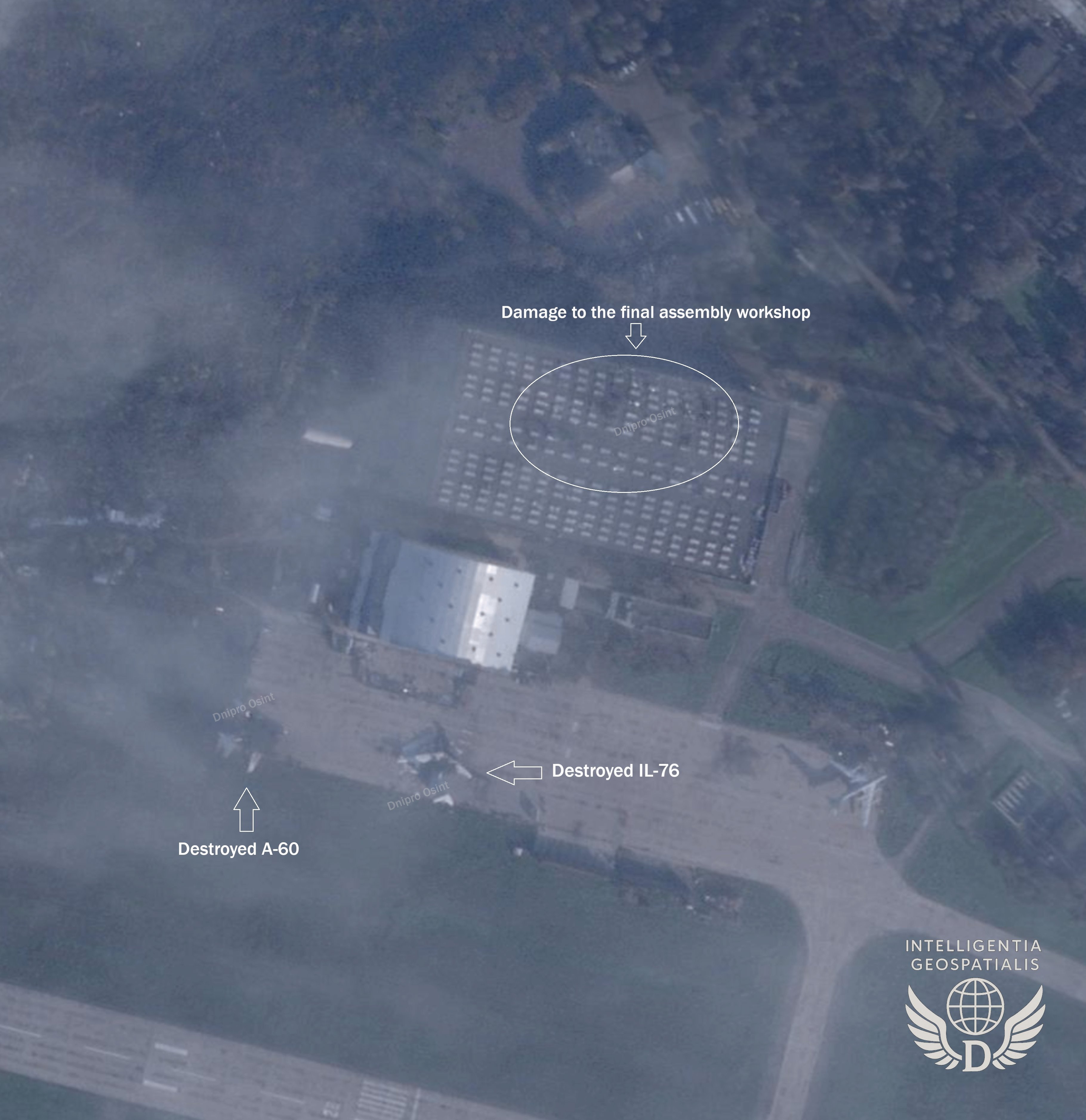 Además, un investigador de OSINT señaló que una plataforma aerotransportada de alerta temprana A-100 (sin su cúpula de radar), el intento, largamente problemático, de Rusia de reemplazar su anticuada flota de A-50 AWACS.