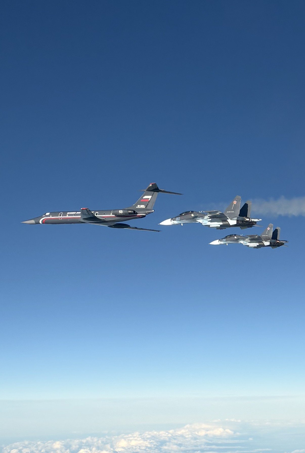 Un inusual avión ruso de entrenamiento de bombarderos Tu-134UBL fue avistado cerca del espacio aéreo de la OTAN sobre el mar Báltico, volando en formación con cazas Su-30 y lo que parecía ser un bombardero o avión de reconocimiento Su-24.