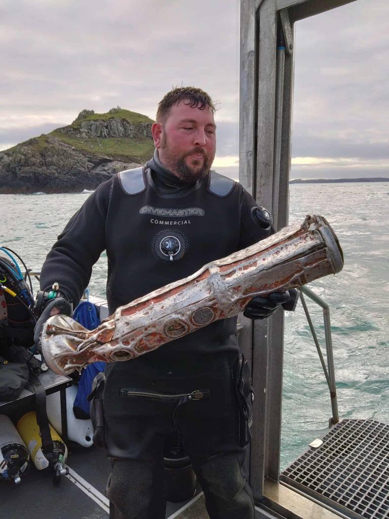 El dispositivo, de aproximadamente 1,2 metros de largo y 15 kilos de peso, estaba encajado en un barranco rocoso de la Zona de Conservación Marina de Skomer. Fue sacado a la superficie con una bolsa de buceo y posteriormente entregado a la Guardia Costera del Reino Unido.