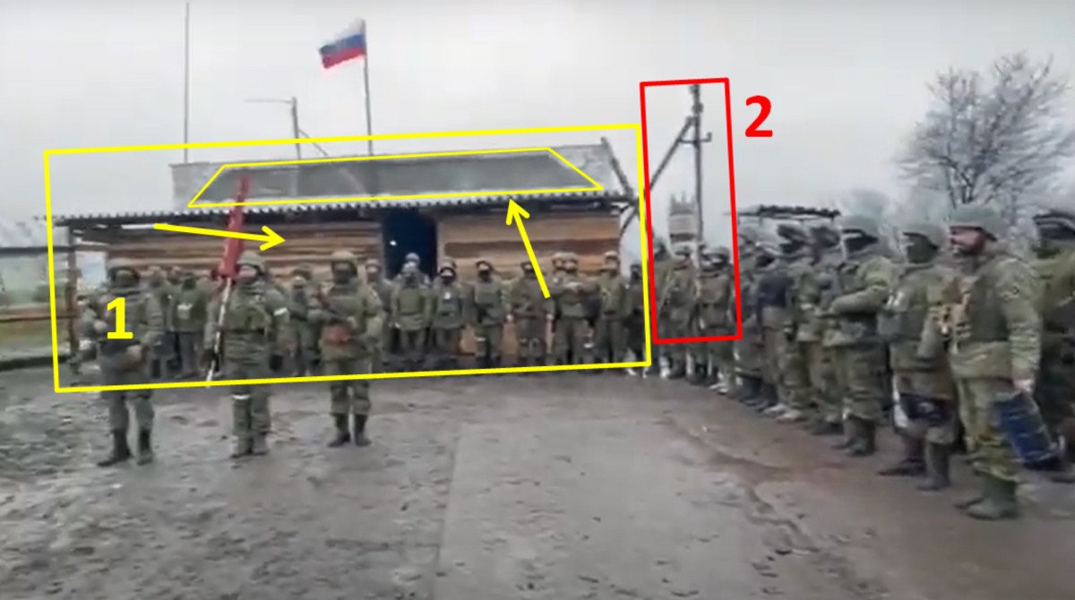 Los analistas cotejaron varias pistas visuales, incluyendo un edificio de madera con un característico techo inclinado, un transformador eléctrico junto a un poste de luz, una estructura camuflada al otro lado de la carretera, baños portátiles y vehículos UAZ, así como señales de tráfico y de dirección que indicaban un cruce cercano.