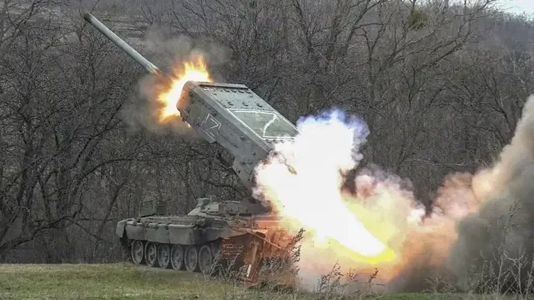 El TOS-1A es un sistema lanzallamas pesado de 220 mm que dispara cohetes termobáricos capaces de destruir fortificaciones y saturar una amplia zona con una sobrepresión extrema. Rusia confía en este sistema para romper las líneas defensivas y apoyar los asaltos con una potencia de fuego devastadora a corta distancia.