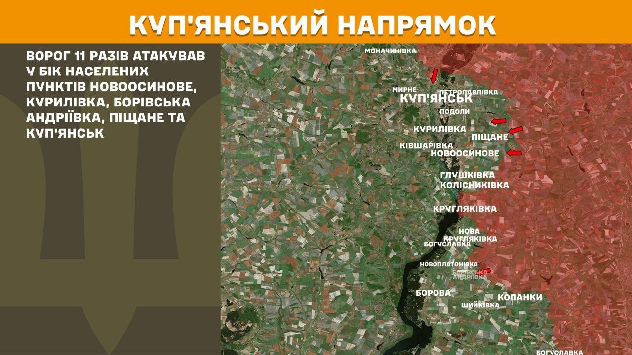 Las fuerzas rusas llevaron a cabo 11 ataques en dirección a Kupiansk, intentando avanzar en zonas como Novoosynove, Kurylivka y Pishchane.
