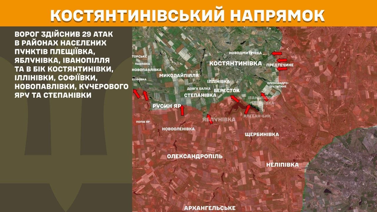 Los combates se concentraron en Pleshchiivka, Yablunivka, Ivanopillia y hacia Kostiantynivka, Illinivka, Sofiivka, Novopavlivka, Kucherove Yar y Stepanivka. Rusia insiste en romper este cinturón defensivo central del Donbás.