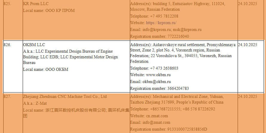El 23 de octubre de 2025, OKBM fue incluida oficialmente en el 19.º paquete de sanciones de la Unión Europea, tras comprobarse que la empresa desempeña un papel clave en la producción de armamento ruso y depende de herramientas importadas de alta precisión.