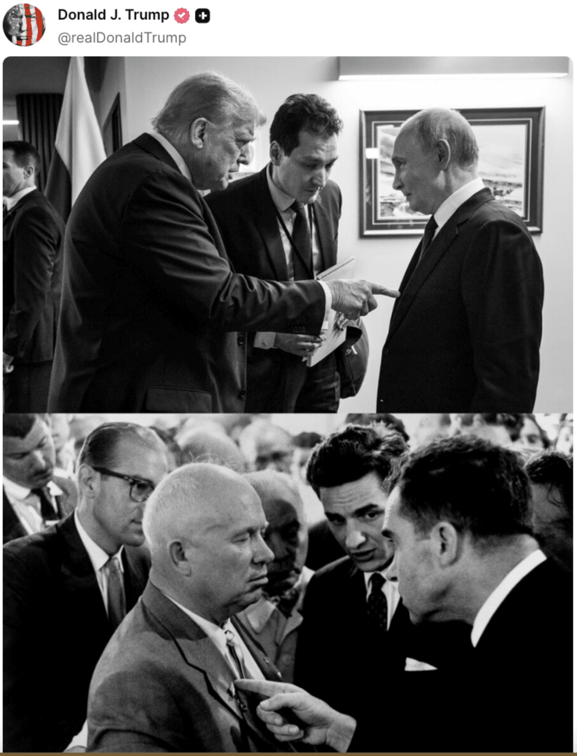 Trump también compartió dos fotos históricas: una con el líder ruso Vladimir Putin en Alaska y otra de 1959 en la que aparecen el entonces vicepresidente Richard Nixon y el primer ministro soviético Nikita Khrushchev. Los observadores han señalado una similitud entre la foto reciente de Trump y Putin y el icónico «debate de la cocina» entre Nixon y Khrushchev.