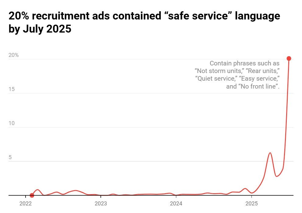 El informe también observa un cambio en los mensajes, con un uso cada vez mayor de expresiones como «unidades de retaguardia», «divisiones no de asalto» y «servicio lejos del frente». A mediados de 2025, alrededor del 20 % de todas las ofertas de empleo relacionadas con el ejército incluían términos de este tipo, lo que supone un aumento significativo con respecto a años anteriores.
