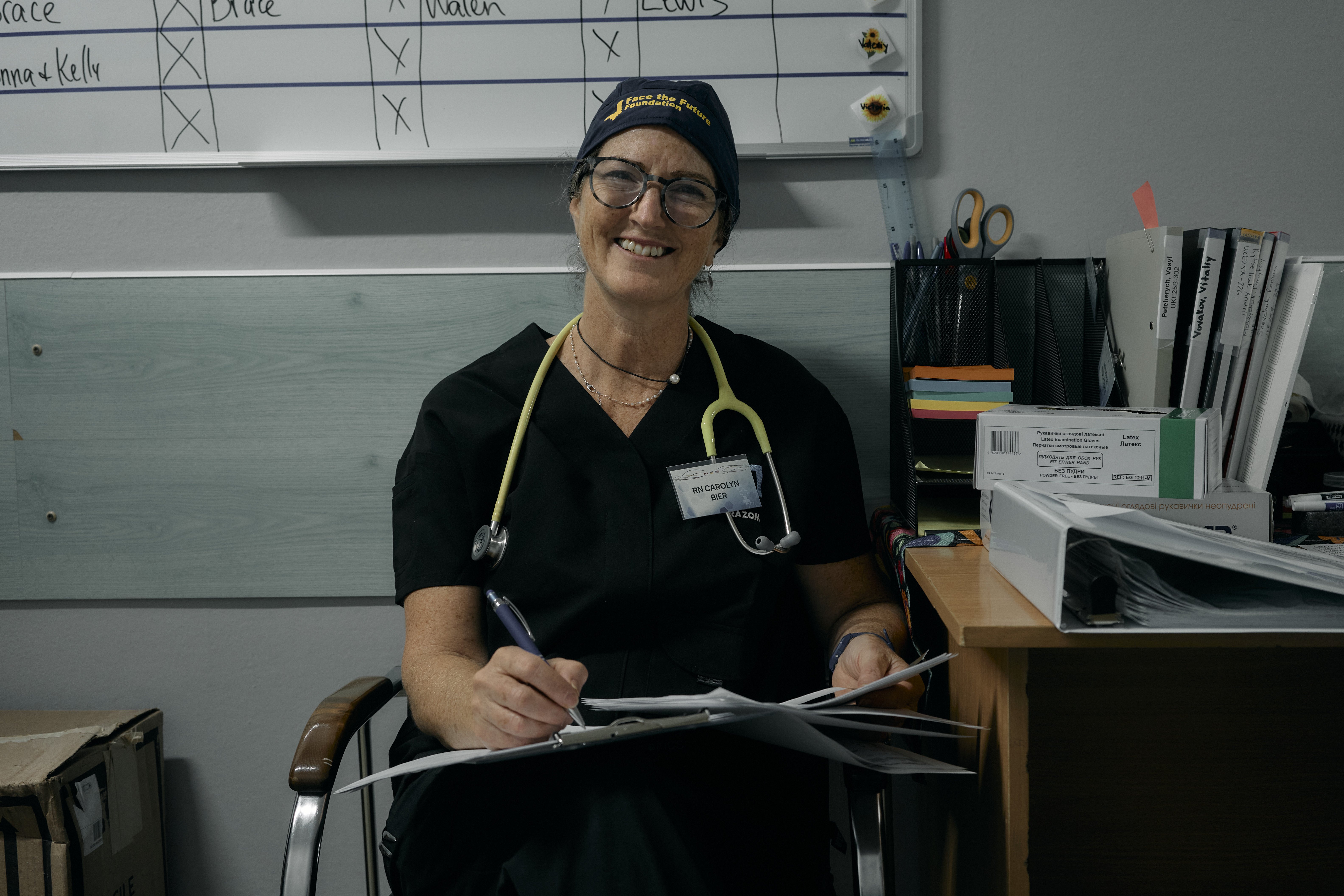Mientras tanto, las enfermeras preparan una sala de recuperación para los pacientes, donde serán atendidos y monitoreados de cerca después de la cirugía. Entre ellas se encuentra Carolyn, de Canadá, quien nunca ha estado en Ucrania y, de hecho, no tenía planes de visitarla próximamente.