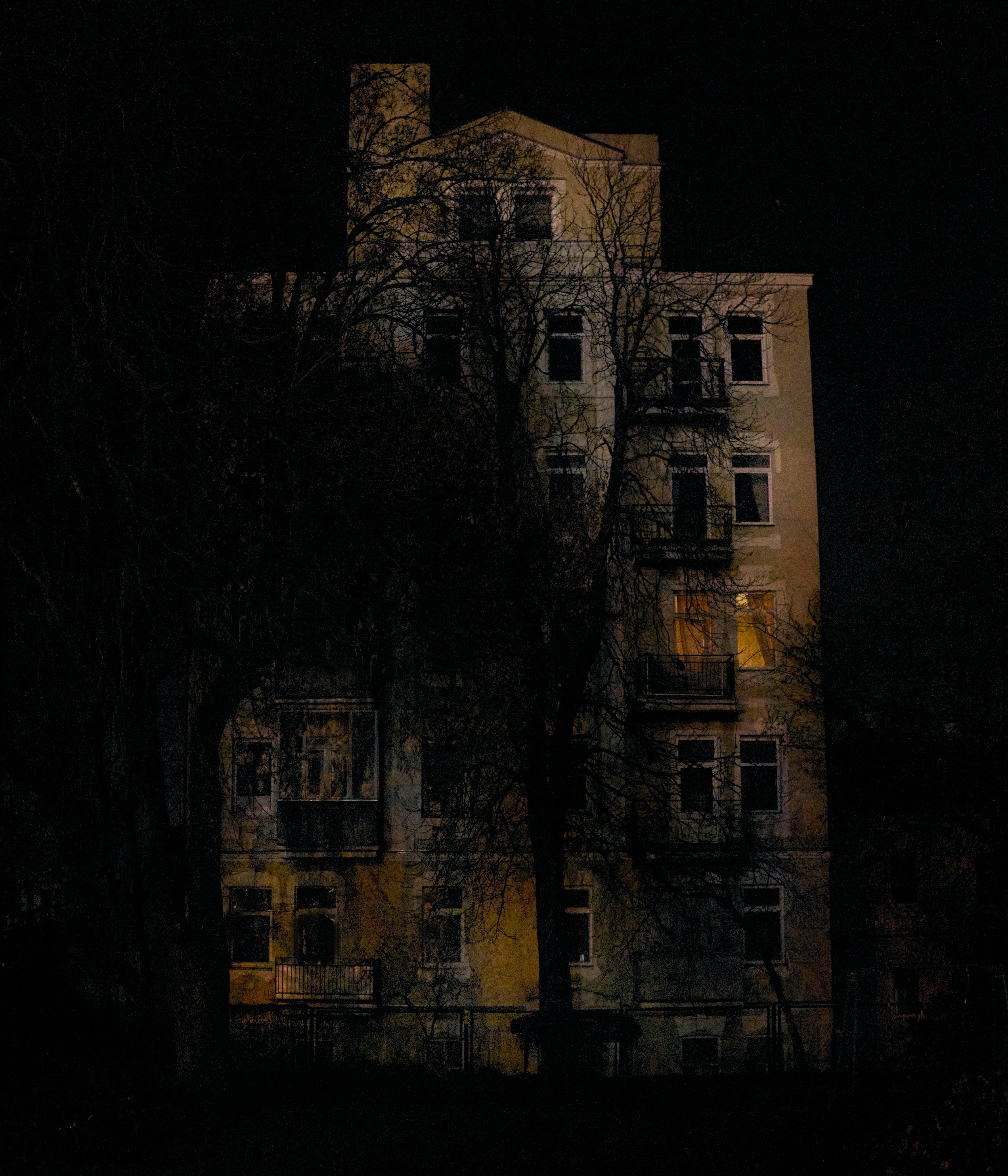 La luz se refracta de forma distinta en las esquinas al acercarse los coches, cuyos faros iluminan brevemente calles normalmente iluminadas por escaparates o farolas. La linterna de un transeúnte proyecta un haz estrecho que baña fugazmente la fachada de un edificio de una manera inusual. El zumbido de los generadores llena el aire.