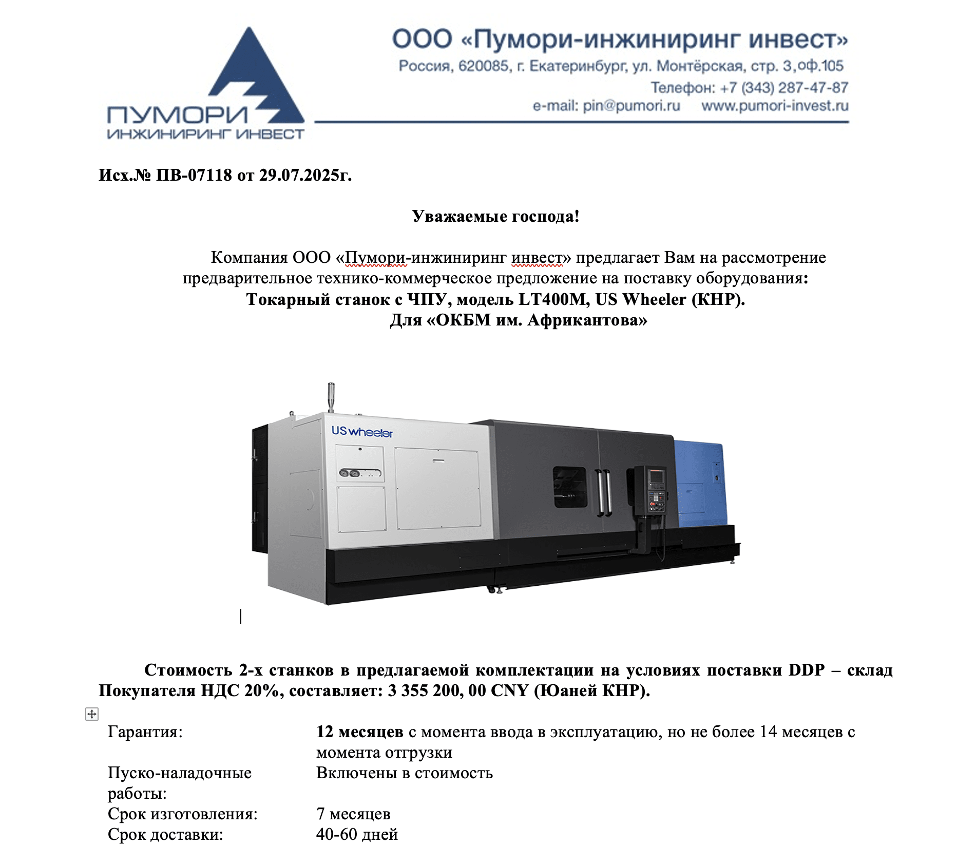 «LLC Pumori-Engineering Invest le ofrece para su consideración una propuesta técnica y comercial preliminar para el suministro de equipos: torno CNC, modelo LT400M, US Wheeler (PRC), para OKBM Afrikantov».