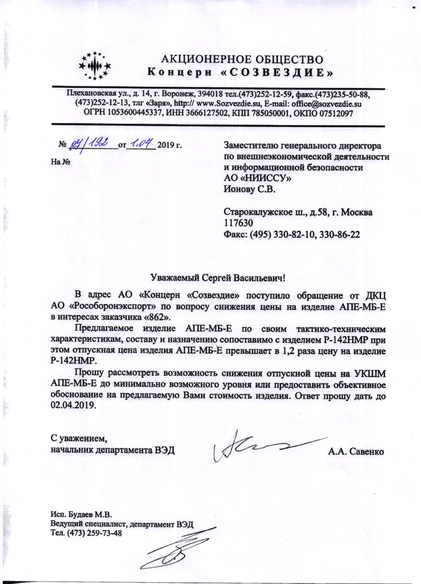 Carta de «Sozvezdie» a NIISSU, con fecha del 1 de abril de 2019.