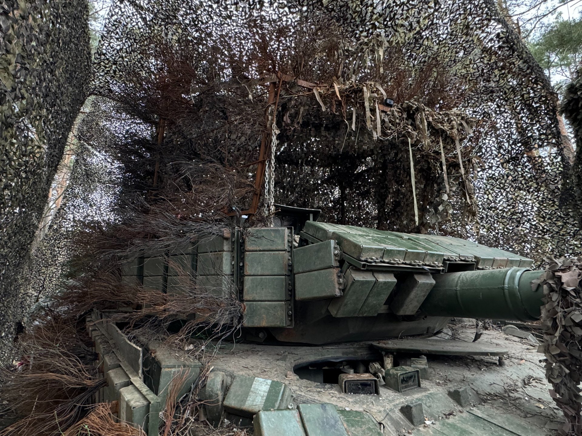 To protect the tanks, crews place them in covered revetments hidden under camouflage nets and add side netting to catch incoming FPV drones.