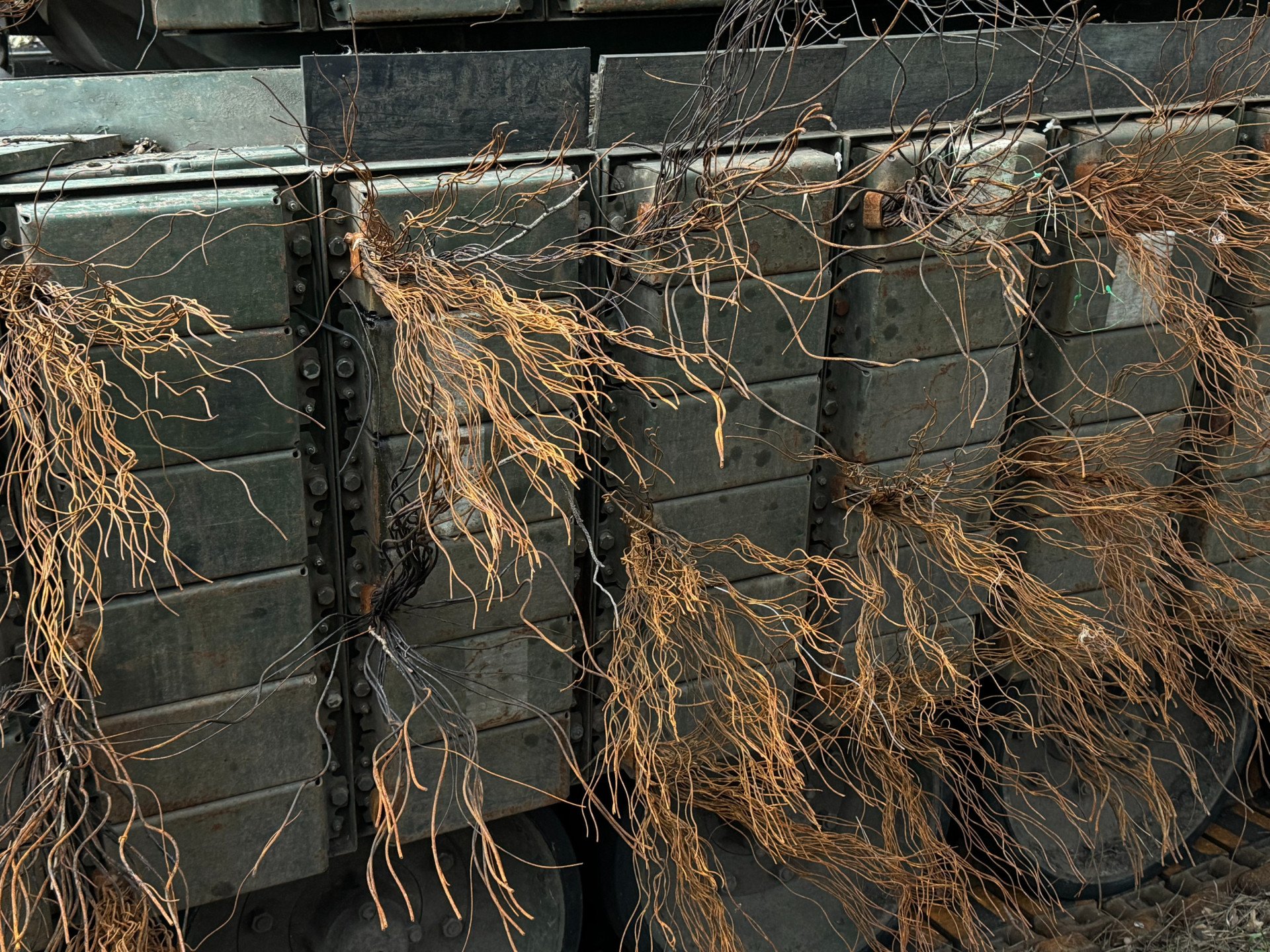 The vehicles are fitted with a roof cage, grilles and chains over the engine compartment, and Ukrainian-made explosive reactive armor on the hull, sides, and turret, including the rear.