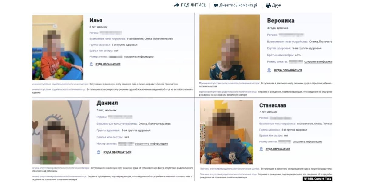 The profiles of the children were still active on the portal “usynovite.rf” as of March 2026. The listings do not indicate that the children are from Kherson or that they are Ukrainian.