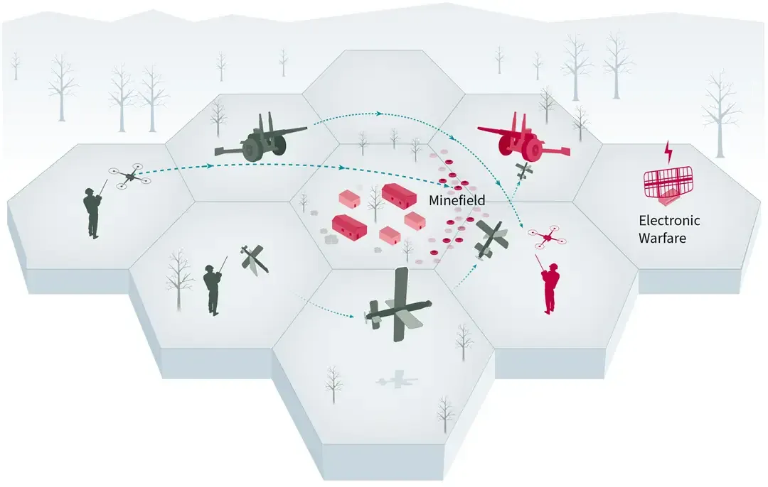Suppression: Sequential attacks starting with artillery, followed by assault operations involving infantry and robotic ground systems (NRKs);