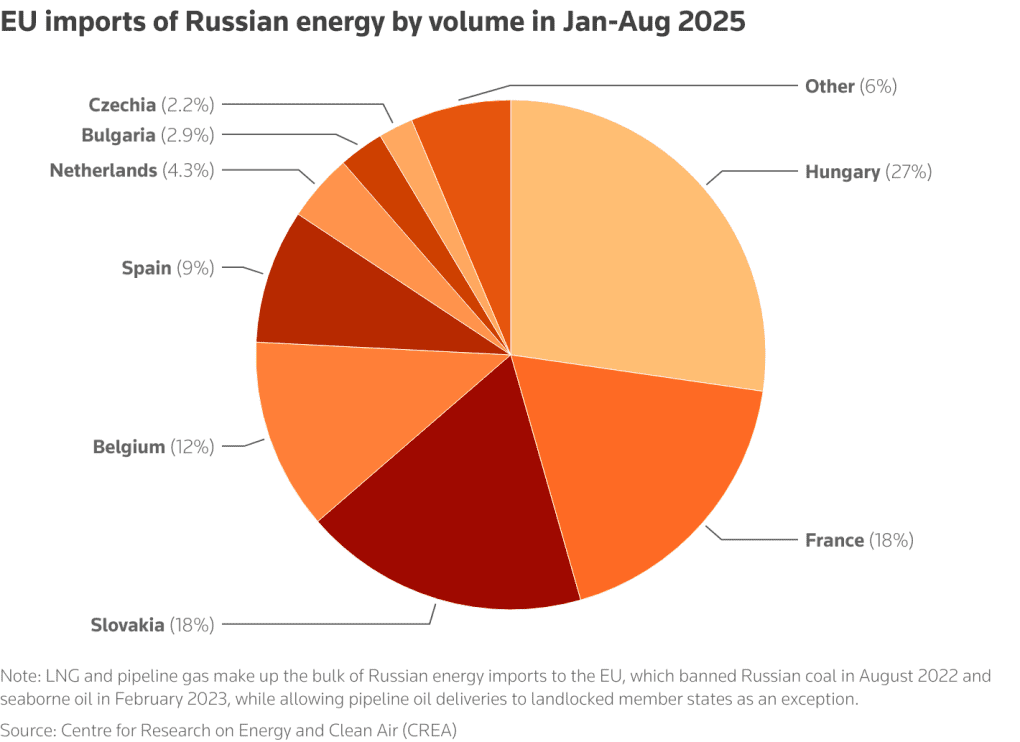 According to Reuters, the EU has reduced its reliance on Russian energy by about 90% since 2022. Yet between January and August 2025, member states still imported more than $11.9 billion in Russian oil and gas. Seven EU countries actually increased their imports compared to last year—including France, where purchases rose 40% to about $2.4 billion, and the Netherlands, up 72% to roughly $538 million.