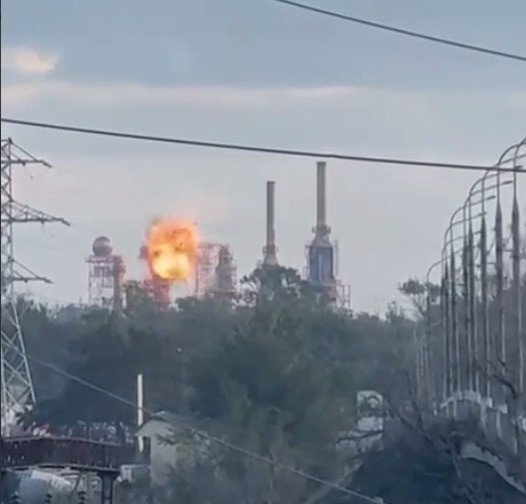 The footage, taken roughly three kilometers from the site, captured a direct impact on refinery infrastructure.