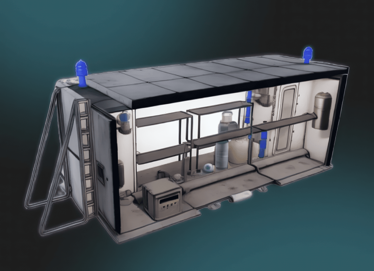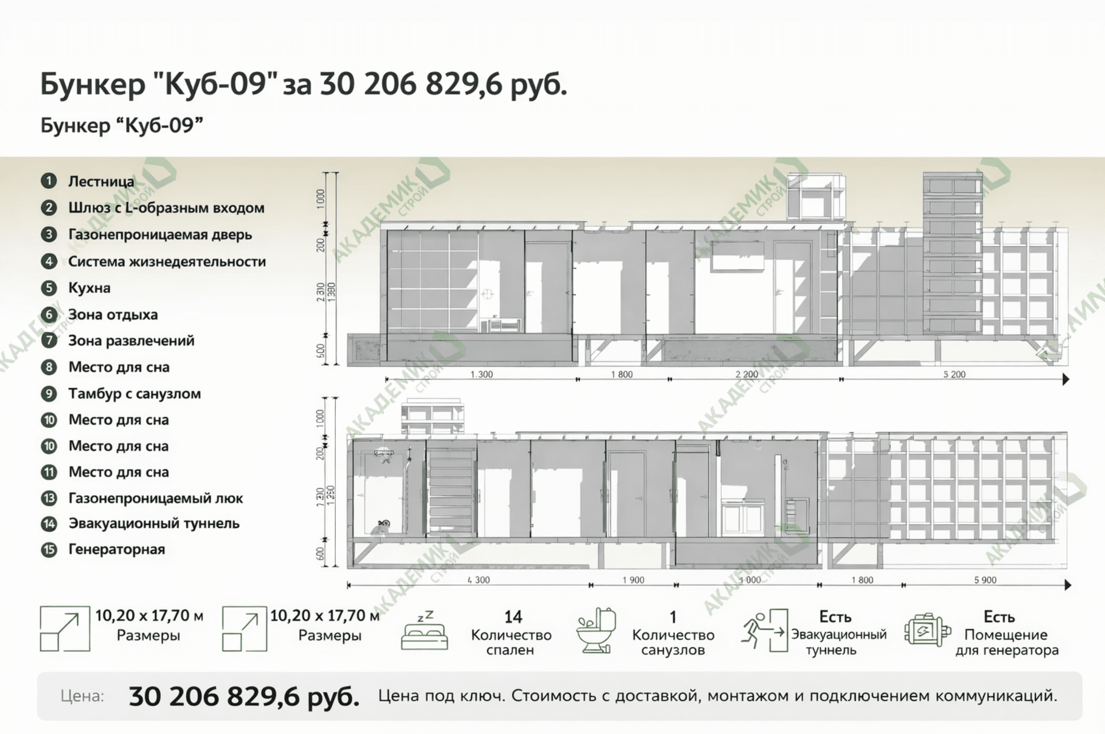 The Kub-09 is taken as an example of a commercially available large underground bunker developed by the Russian company Akademik-Stroy, designed to accommodate 12 to 14 people in a self-contained shelter with a total area of 74.73 square meters and a usable area of 61.7 square meters.