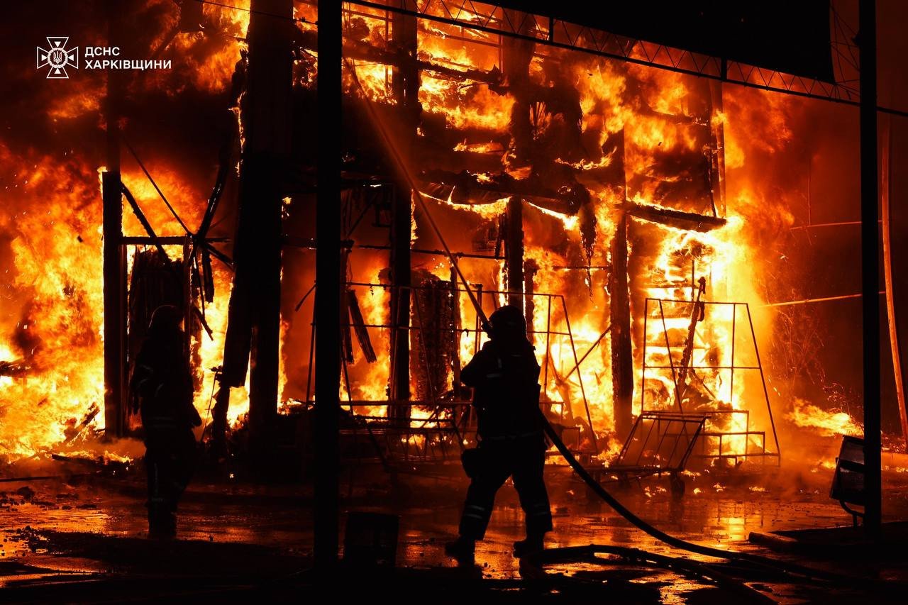 The Kyivskyi district came under heavy fire near the Barabashova metro station. The explosions ignited a massive blaze in market pavilions, spreading across more than 2,800 square meters.