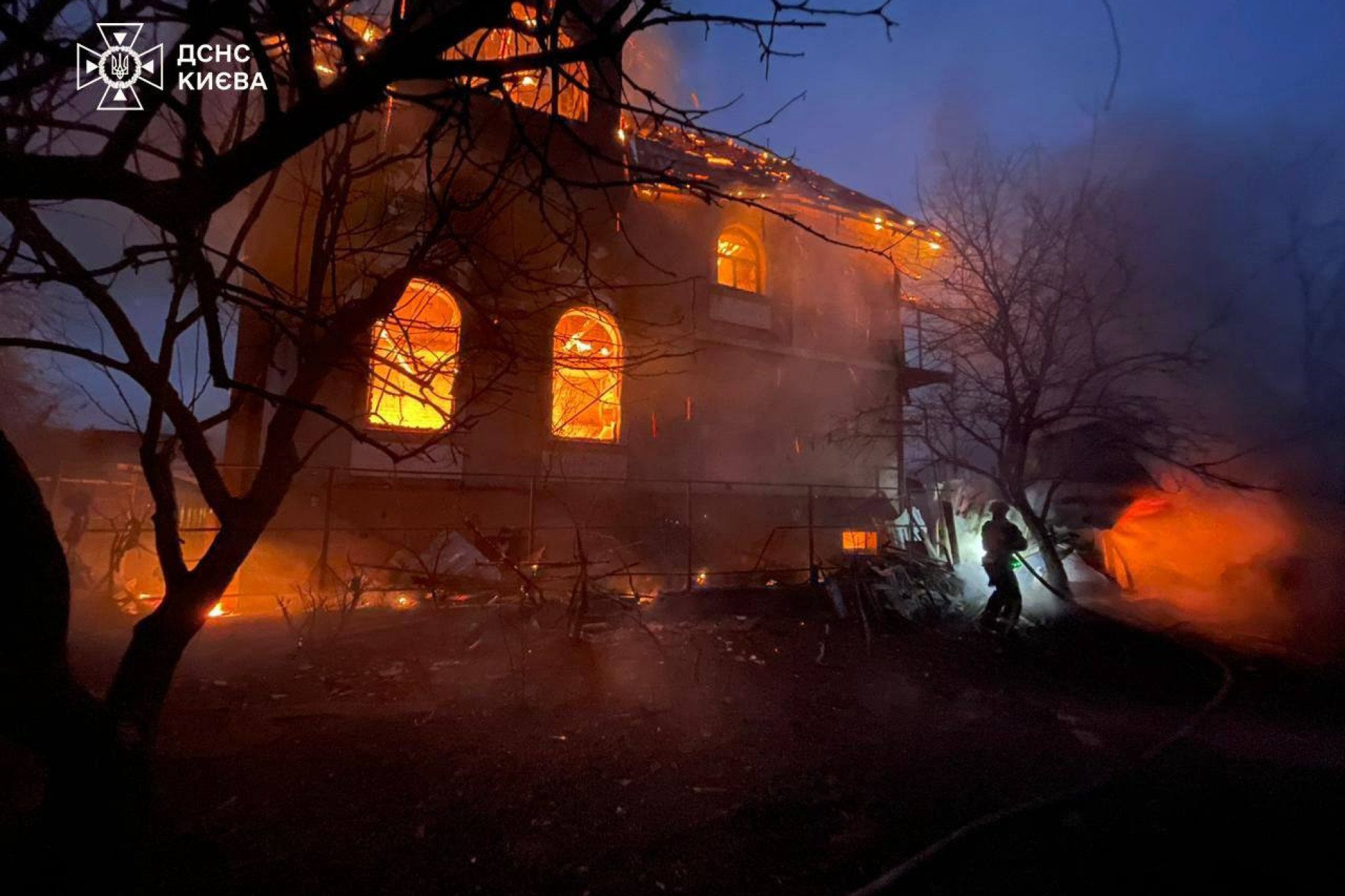 In Holosiivskyi, fragments from a downed drone caused a fire involving three vehicles parked at a car service station. In Obolonskyi, a private three-story house caught fire following the strike. In Darniytskyi, private residential buildings were damaged, and ten residents of a nearby elderly care facility were evacuated due to the risk of fire.