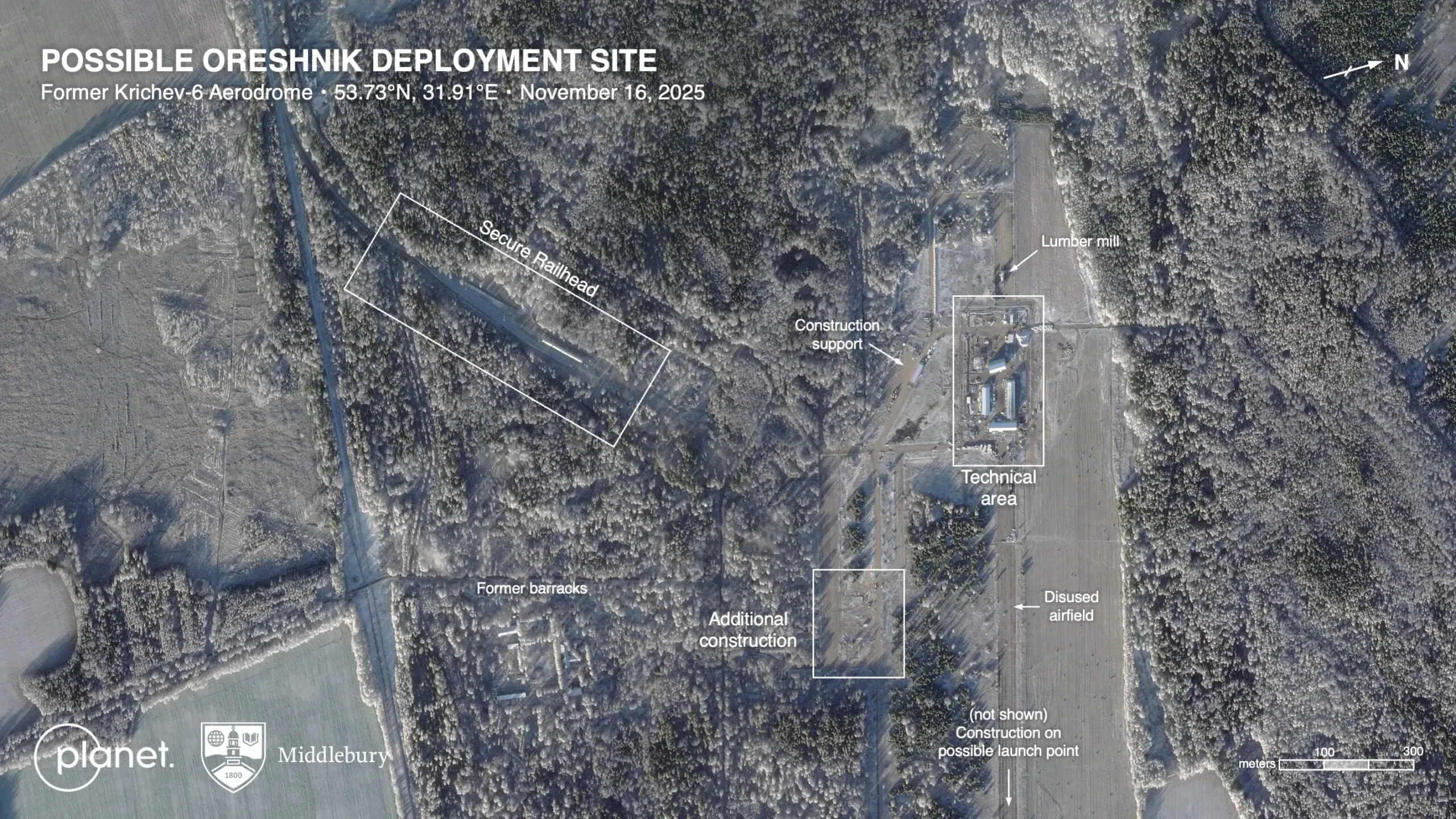Analysts affiliated with the Middlebury Institute of International Studies, including Dr. Jeffrey Lewis and colleagues Michael Duitsman and Decker Eveleth, identified the former Krichev-6 airfield in eastern Belarus as the likely location for the Oreshnik missile deployment. The site is situated just 4–5 kilometers from the Russian border in the Mogilev region.