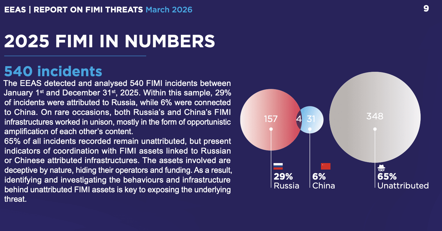 The EEAS noted that major political and news events are especially vulnerable moments, with nearly half of the recorded incidents tied to elections, protests, or international crises.