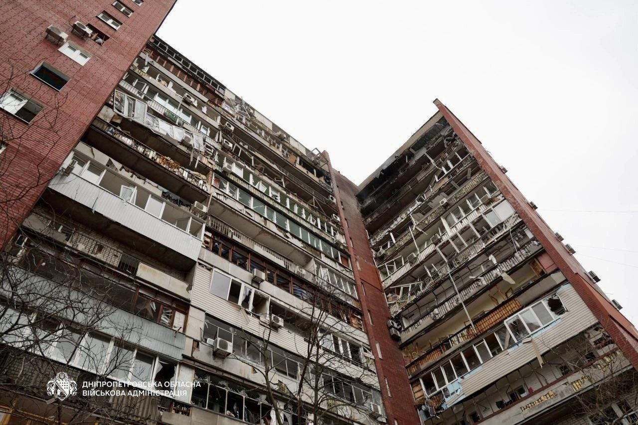 Ukrainian Pravda reported that walls, balconies, windows, and the building’s technical floor were damaged in the impact.