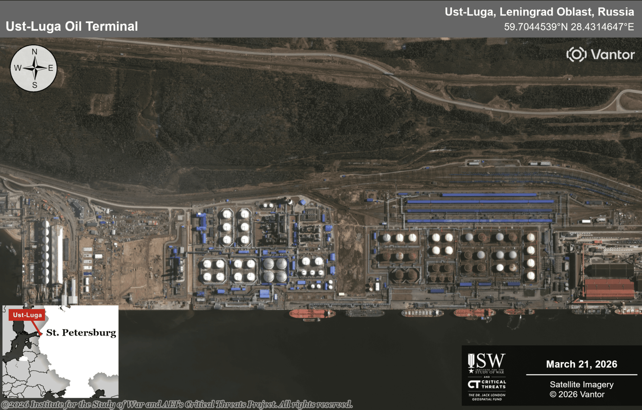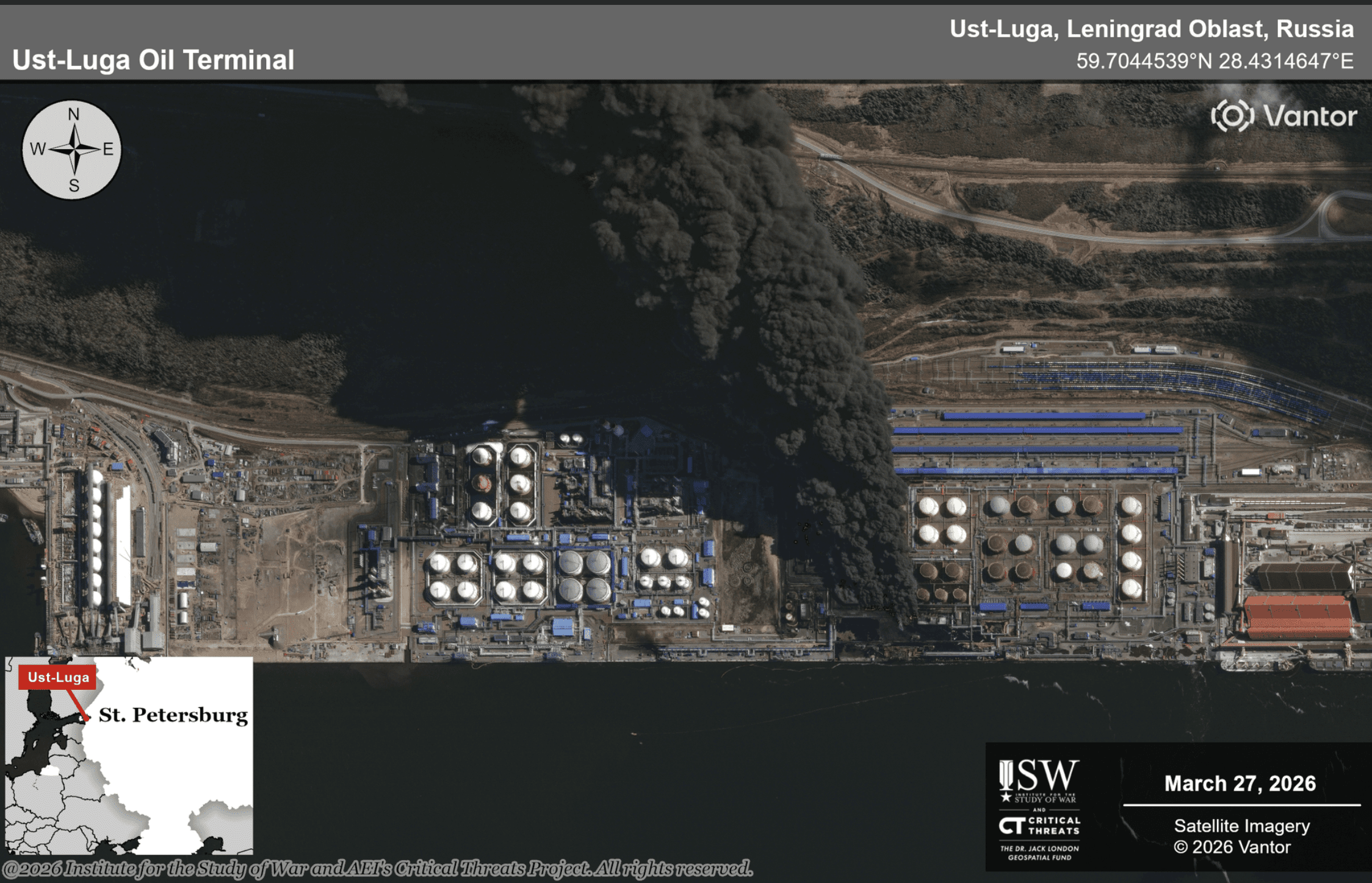 Satellite imagery showed major fires at the Russian ports of Ust-Luga and Primorsk after recent Ukrainian strikes, according to the Institute for the Study of War (ISW) on March 28.