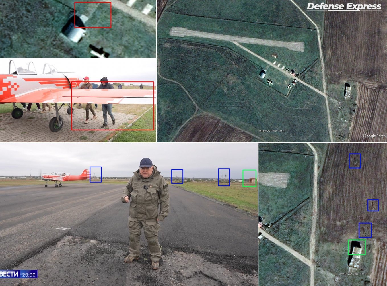 The airfield’s layout, including a narrow taxiway connecting at an angle to the main runway and a small metal hangar accessed via a tiled pedestrian-style path, matched the details seen in the Russian broadcast. The dark asphalt surface and distinctive infrastructure helped confirm the site’s identity when compared with 2020 and 2025 satellite imagery.