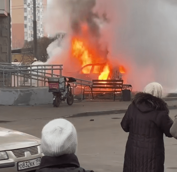 The blast occurred near the “Grad Moskovsky” apartment complex. The explosion shattered windows in several apartments, and the vehicle was quickly engulfed in flames.