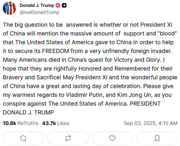 President Donald Trump accused China, Russia, and North Korea of conspiring against the United States, making the claim as Xi Jinping held a massive military parade marking the 80th anniversary of the end of World War II and Japan’s surrender,The Moscow Times reported on September 3.
