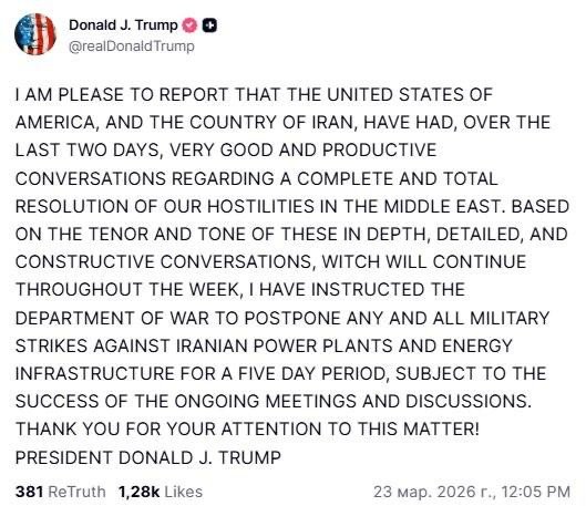 On March 23, Trump announced the decision in a post on Truth Social after what he described as progress in discussions with Tehran.