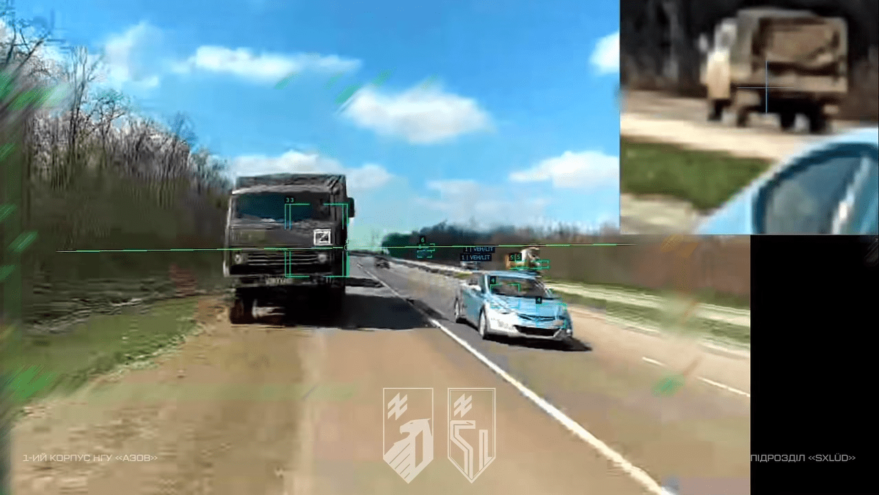 The published video material shows drone strikes on Russian military trucks, including Kamaz and Ural platforms, operating along key logistical routes near Donetsk. The footage indicates that the drones can distinguish between targets, marking them through a multi-stage identification system before operator confirmation and engagement.