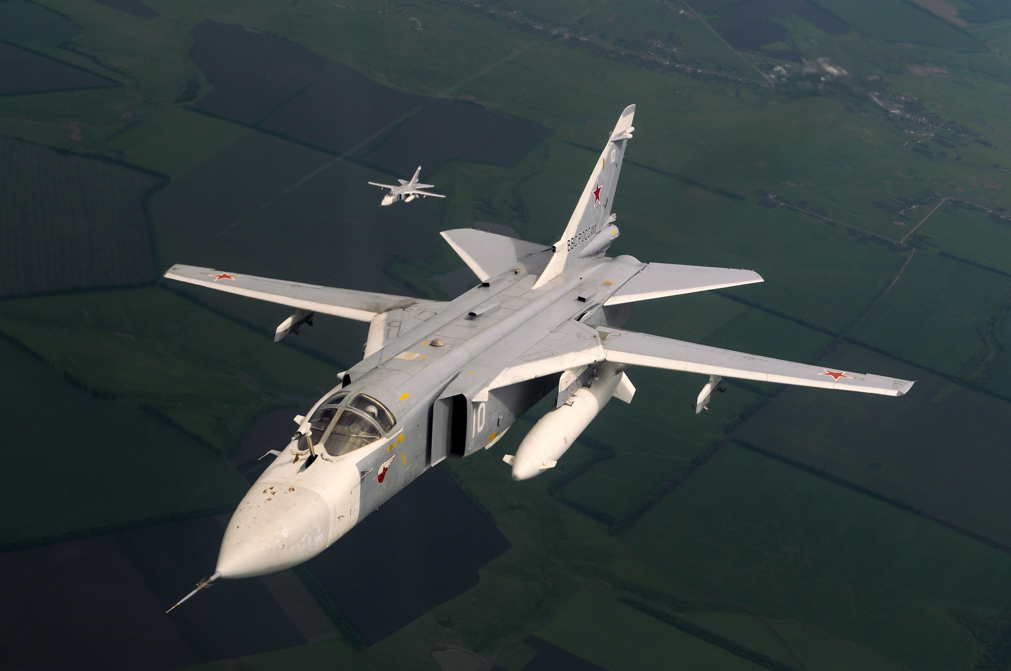 Su-24 tactical bombers, featuring variable-geometry wings and terrain-following radar, are optimized for low-altitude strike missions. While considered outdated by modern standards, the aircraft remains in active service due to the lack of sufficient replacements.