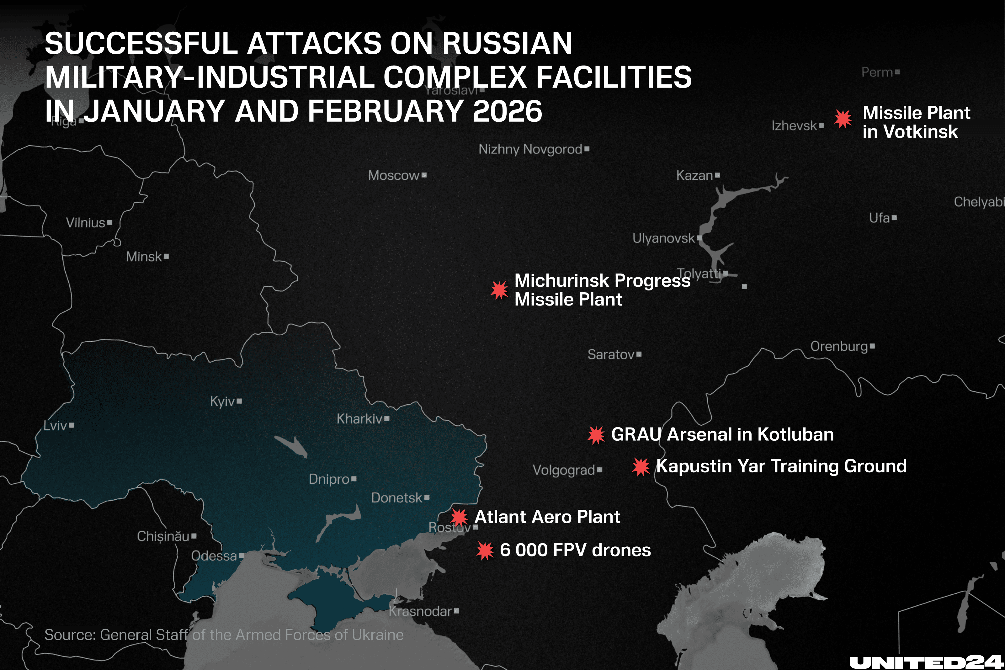 Ukraine’s defense forces carried out a series of long-range strikes in January and February 2026 targeting key elements of Russia’s military-industrial complex, missile testing infrastructure, and ammunition storage network, according to Ukraine’s Ministry of Defense on March 9.