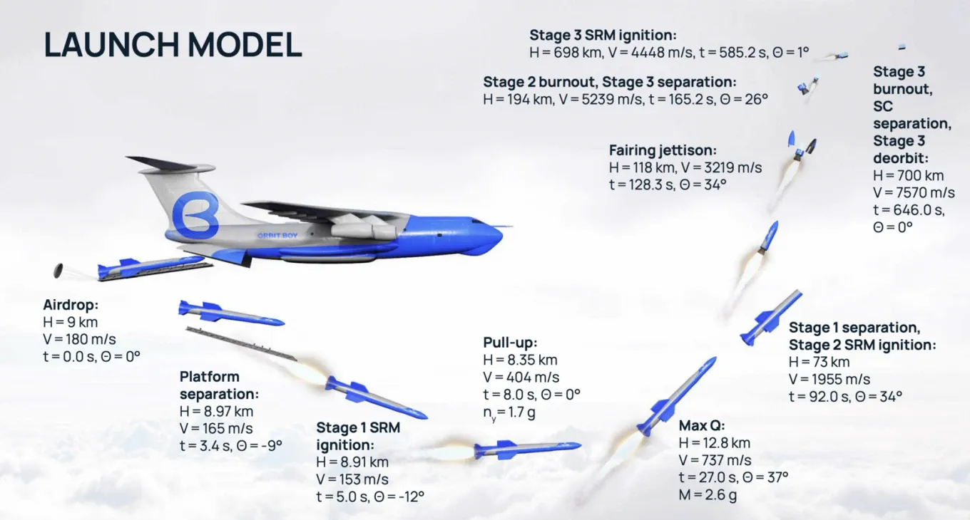 Orbit Boy’s concept centers on a multi-stage rocket capable of delivering up to 400 kilograms of payload into orbit. The launch sequence begins with the release of the rocket from a transport aircraft at altitude, after which the system separates and ignites its engine within seconds, continuing ascent independently.