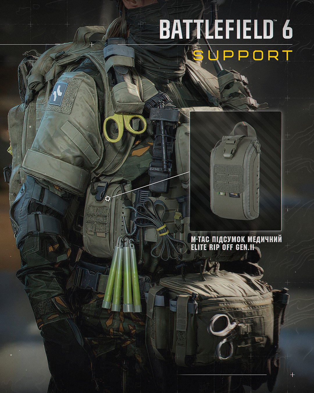 ![M-Tac’s elastic MOLLE Gen. III tourniquet holder and Large Elite horizontal medical pouch displayed on a Battlefield 6 Support-class unit. (Source: M-Tac/Battlefield Studios) M-Tac’s elastic MOLLE Gen. III tourniquet holder and Large Elite horizontal medical pouch displayed on a Battlefield 6 Support-class unit. (Source: M-Tac/Battlefield Studios)]()