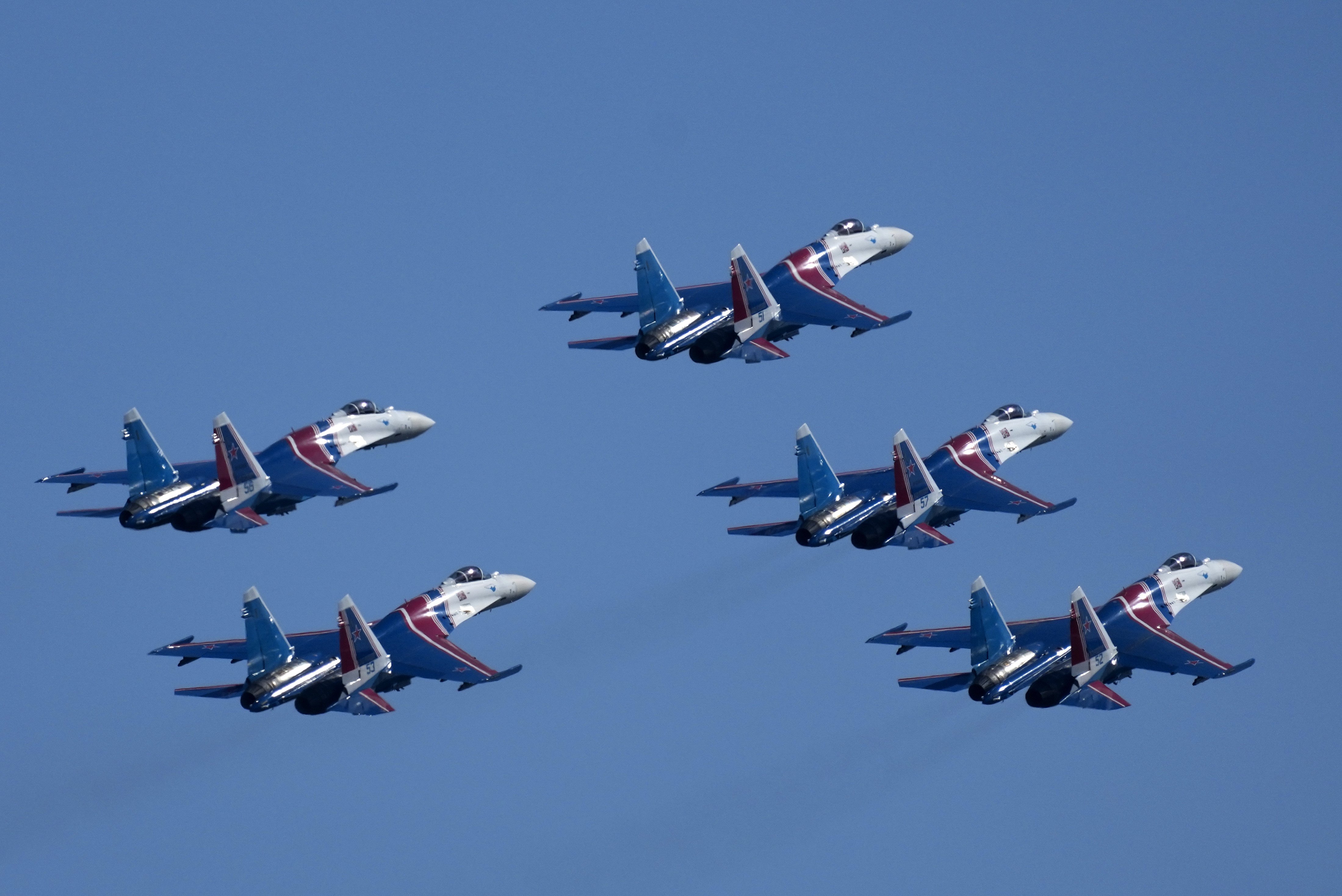 ![Sukhoi Su-35S fighter jets perform during the International Military-Technical Forum “Army 2022” at the Kubinka training ground near Moscow, Russia, on August 17, 2022. (Source: Getty Images) Sukhoi Su-35S fighter jets perform during the International Military-Technical Forum “Army 2022” at the Kubinka training ground near Moscow, Russia, on August 17, 2022. (Source: Getty Images)]()