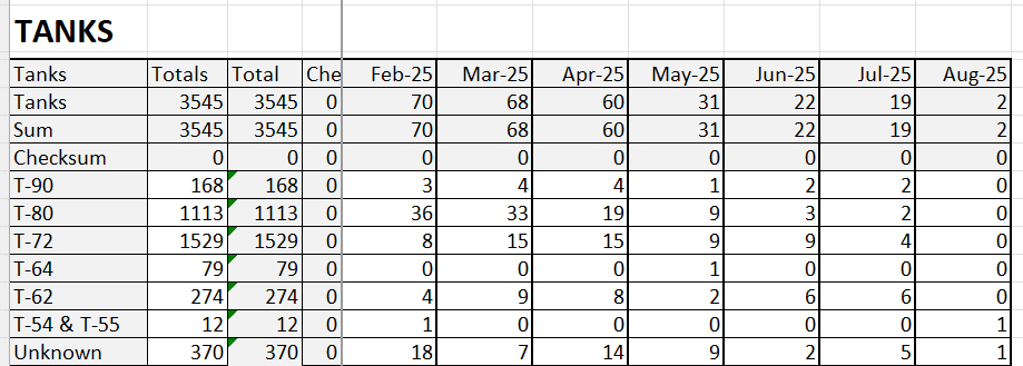 Since the start of the full-scale invasion, Russia has lost 3,545 tanks as of July 2025, according to Richard Vereker. Losses in recent months have been among the lowest recorded: 19 in June and 25 in July, compared to 70 in February, 68 in March, 60 in April, and 31 in May. Preliminary August figures show only two tanks lost so far.