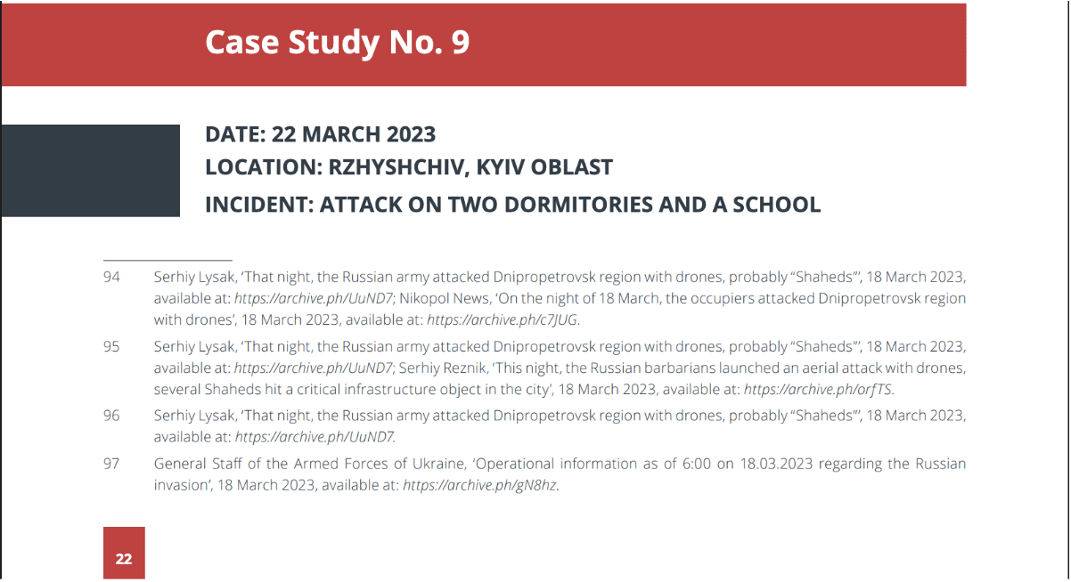 The lawsuits detail five Russian attacks between 2023 and 2025, which resulted in dozens of Ukrainian casualties. One such case was previously investigated by Ukraine’s Independent Anti-Corruption Commission (NAKO) and IPHR in a joint report titled TERROR IN THE DETAILS: Western-made Components in Russia’s Shahed-136 Attacks. It refers to a drone strike on the night of March 22, 2023, in Rzhyshchiv, Kyiv region. Drones hit a school and two adjacent dormitories, killing nine people and injuring 29.