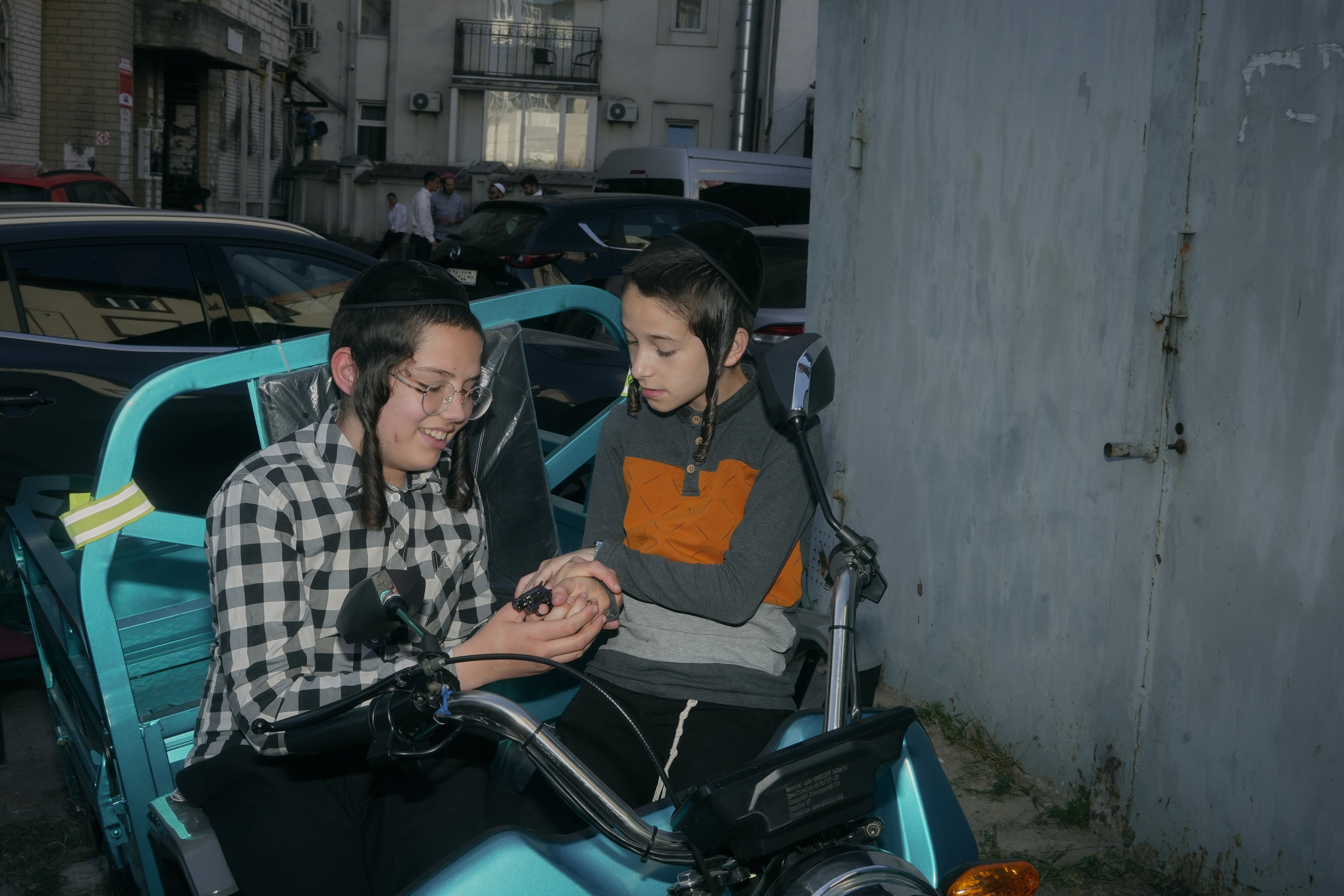 Two Hassidic boys play outside of the synagogue. Uman, Ukraine. September, 2025. Photo: Josh Olley/UNITED24 Media