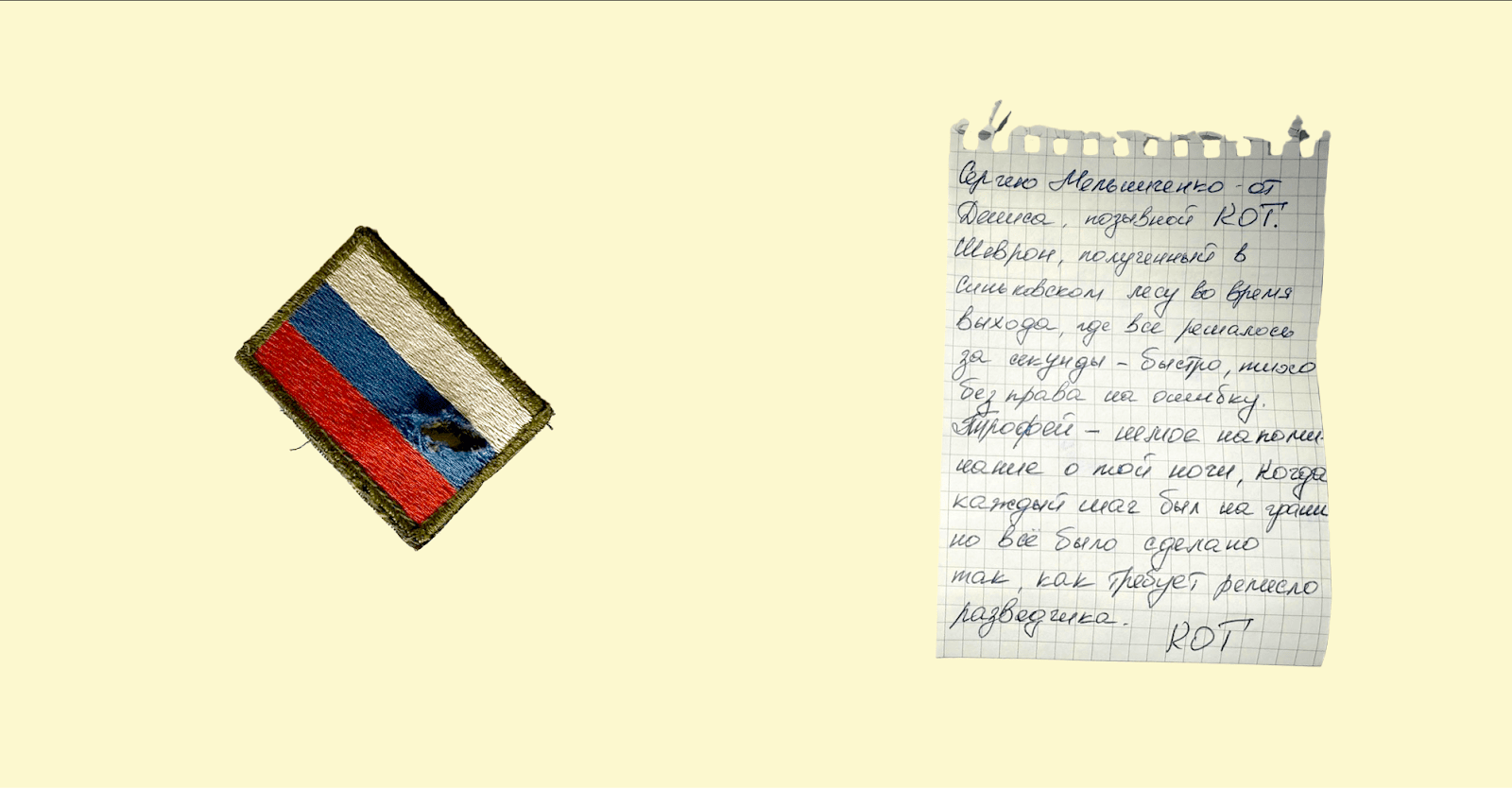 The chevron was taken during an exfiltration in the Synkivskyi Forest, an operation in which decisions were made in seconds and mistakes were not an option. It became a trophy and a silent reminder of that night, when every step carried risk but the work was carried out as the craft of a scout requires.