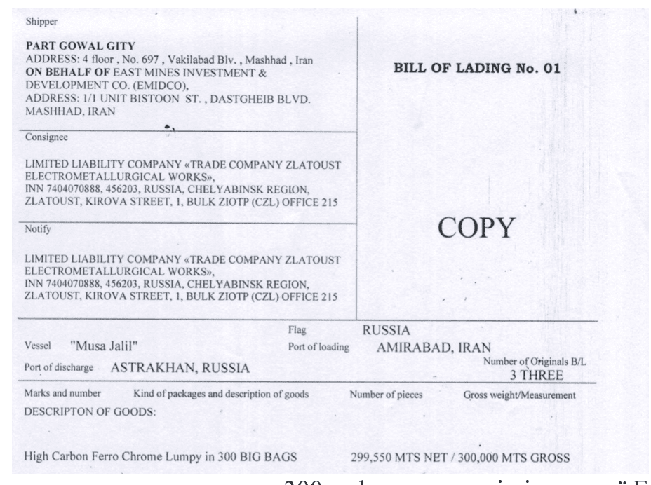 Returning to the chain, after on-paper only transfers between the intermediaries, the ferrochrome was ordered to the Zlatoust Metallurgical Plant for the manufacture of high-alloy steels for defense industry clients. The bill of lading clearly shows all major parties: