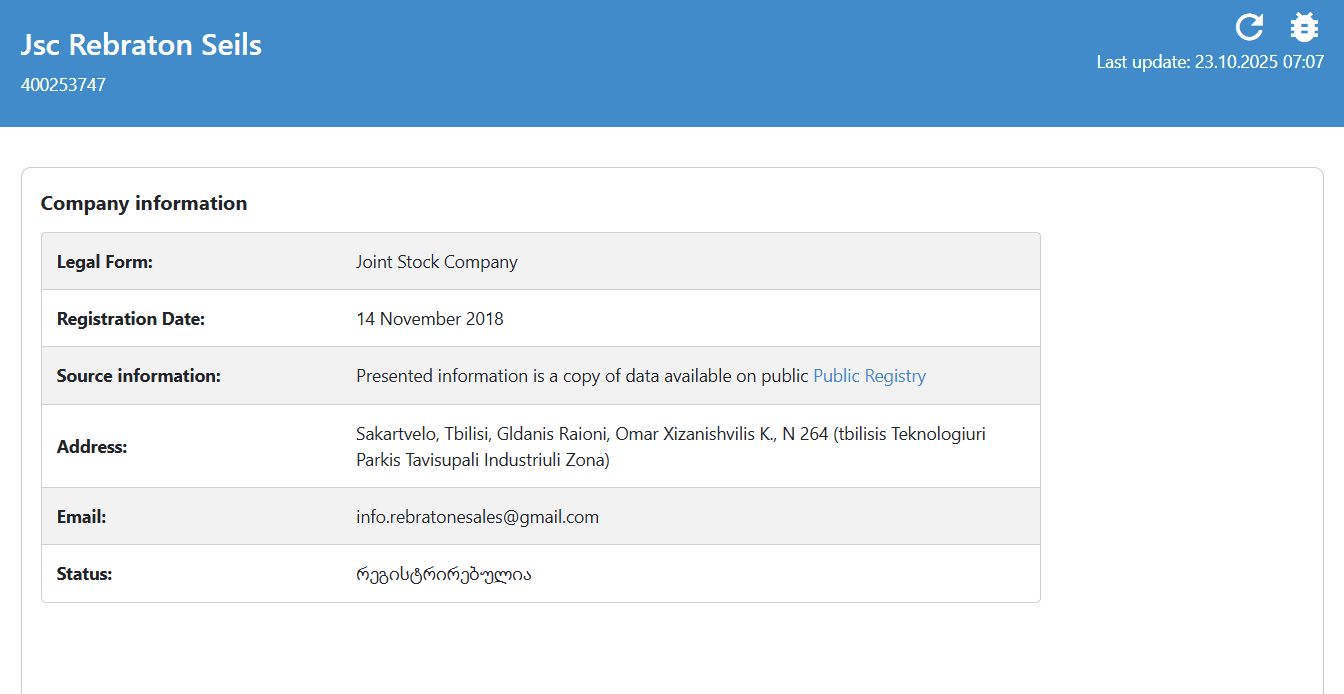 One immediate question is, why this chain? When the deal was established, ferrochrome was not sanctioned, and Russia was not under as strict sanctions as it is now. There are a few reasons. Iran was still under sanctions, and there were still other sanctions applicable to Russia, meaning that obscuring the transactions via intermediaries would better avoid scrutiny. Yet, it is unclear whether this is the case. What we can see, however, is that Rebratone’s address is in the Tbilisi Free Zone.