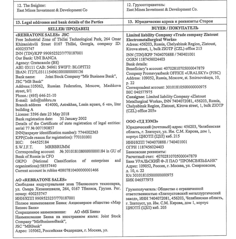 The most illuminating document showing the chain from Iran is a contract signed prior to Russia’s full-scale invasion of Ukraine. This is contract No.12-418TD dated October 14, 2021, for $6 million. It pertained to the purchase of ferrochrome from the Iranian company East Mining Investment and Development Company (EMIDCO) through the Georgian company Rebratone Sales JSC.