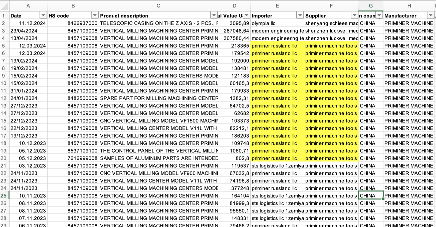 Data shows that deliveries originated from the Chinese manufacturer—Priminer Machine Tools Dongguan Co., Ltd—while the Russian recipient listed was the subsidiary LLC “Priminer Russland.”