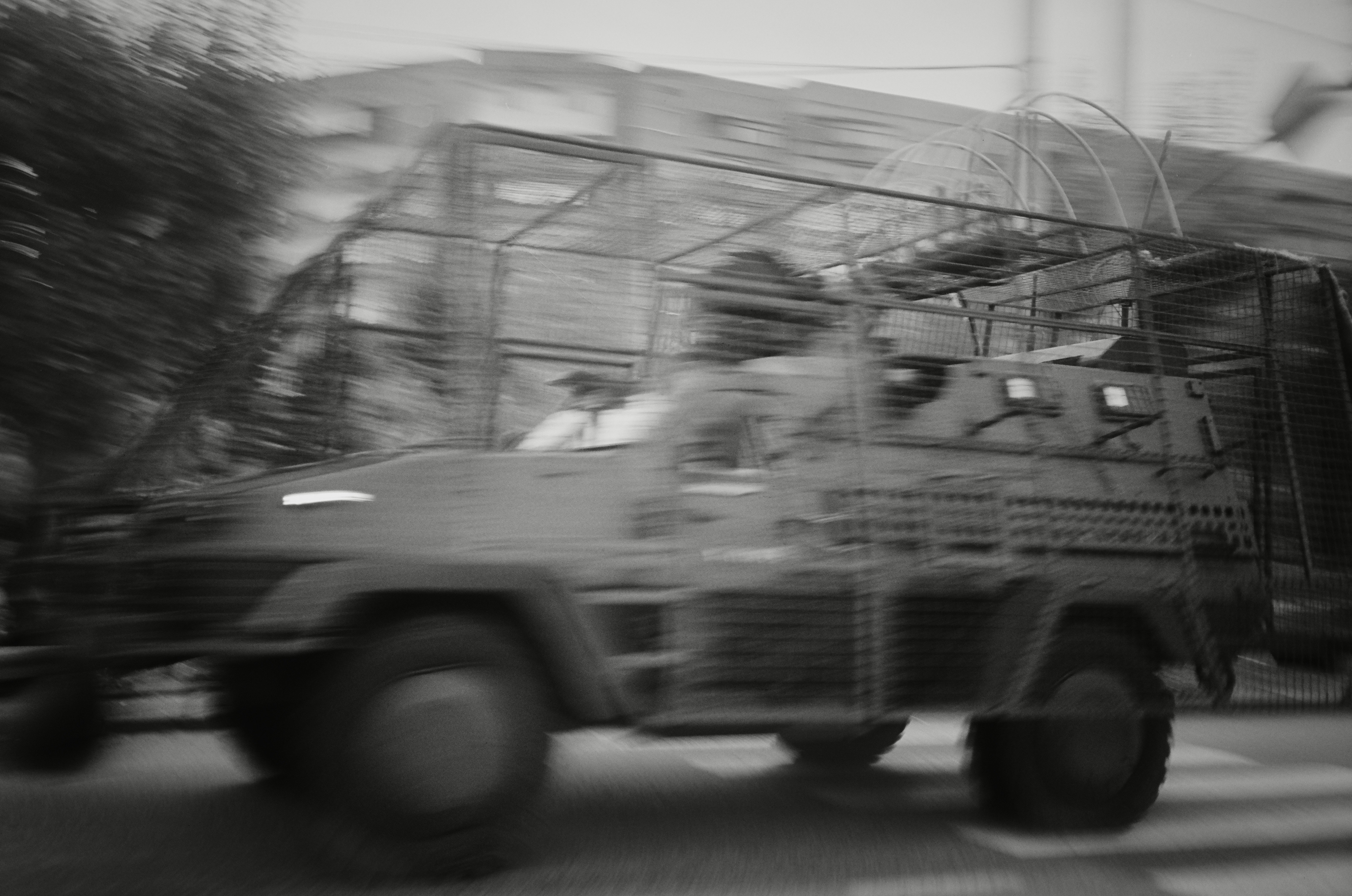 “If a drone flies to us, how long do we have?” we ask, in the back of a pickup. We’re feeling safe so far, surrounded by a Mad Max-looking escort.