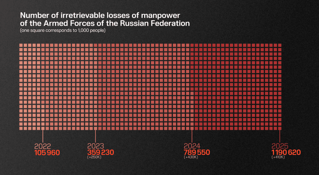 It is in this direction that Russia has concentrated its largest forces and conducts the highest number of assaults: dozens per day occur in Pokrovsk alone. Over the past year, Russia managed to occupy an additional 10% of the Donetsk region, paying for it with the lives of some 400,000 of its soldiers. For the second year in a row, the number of killed and irreversibly wounded has exceeded this figure.